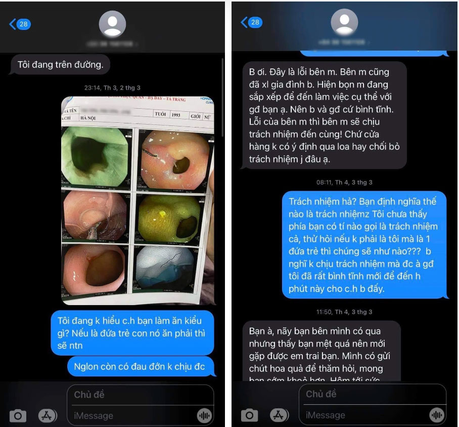 Tin nhắn phía quán ăn cung cấp cho thấy họ không vô trách nhiệm và có thăm hỏi chị P.N.