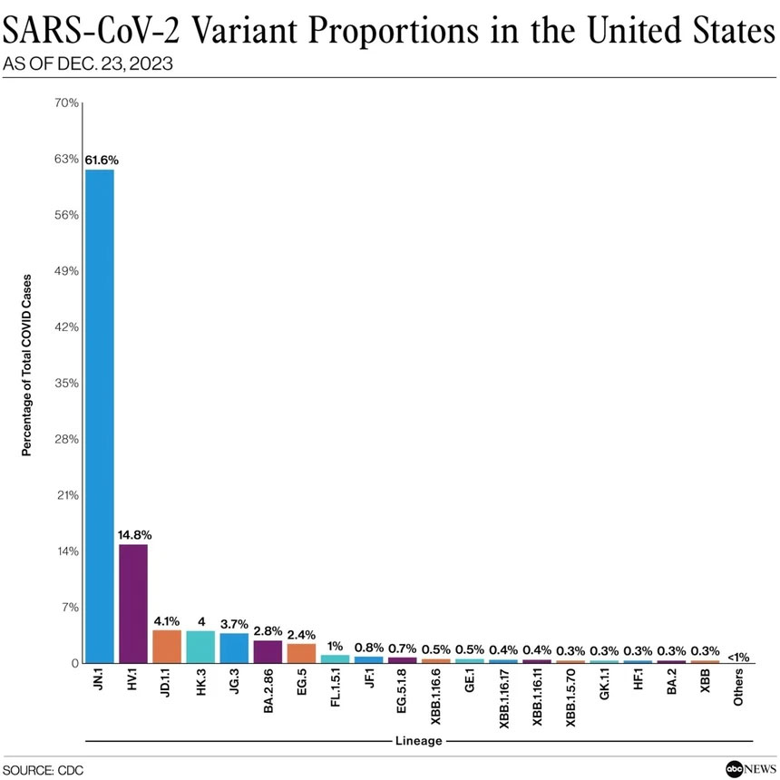 Tỷ lệ các biến thể của virus SARS-CoV-2 trong các ca mắc Covid-19 tai Mỹ tính đến ngày 23/12/2023. Đồ họa: ABC News.
