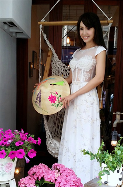 Thanh Đào diện đầm trắng tạo dáng cùng nón lá Việt Nam