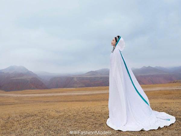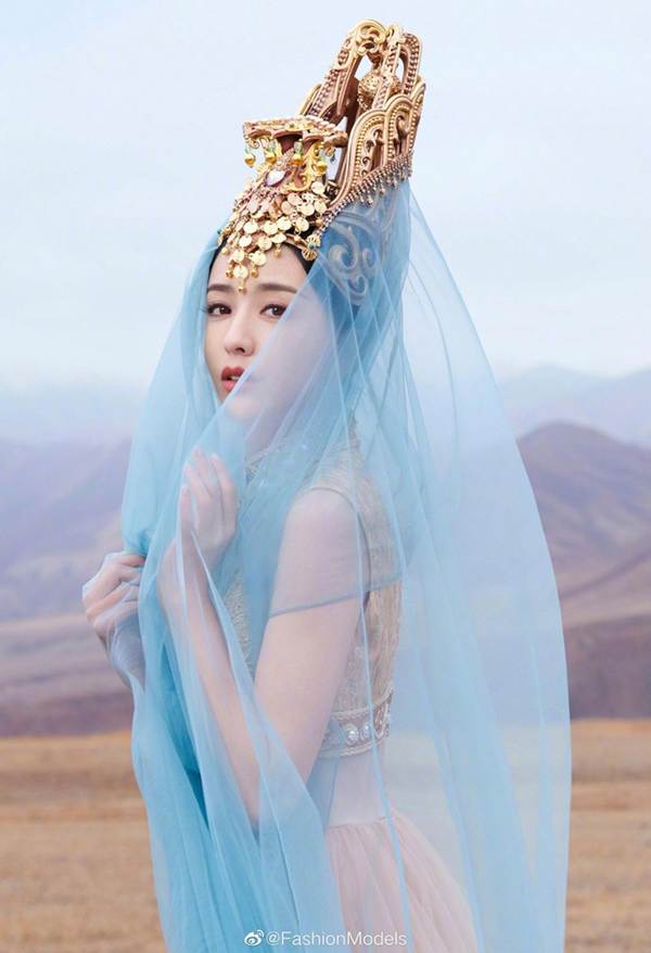 Trong chùm ảnh, nữ diễn viên "Cung - Toả tâm ngọc" diện trang phục như của phụ nữ Tây Vực thời phong kiến, với mũ đội đầu cầu kỳ và khăn che mặt.