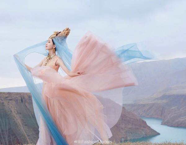 Lớp vải voan tung bay càng khiến Đồng Lệ Á đẹp thoát tục như tiên nữ hạ phạm. Dân mạng đồng loạt khen nức nở trước sắc vóc hiếm có của bà xã Trần Tư Thành.