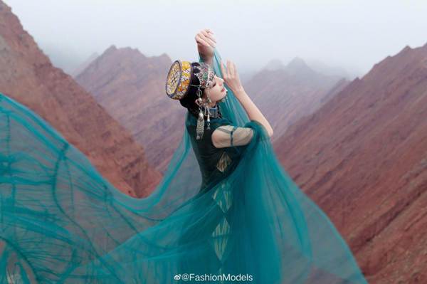 Lấy bối cảnh trên núi, mỹ nhân Tân Cương 8x thực hiện các động tác vũ đạo uyển chuyển.