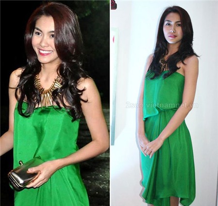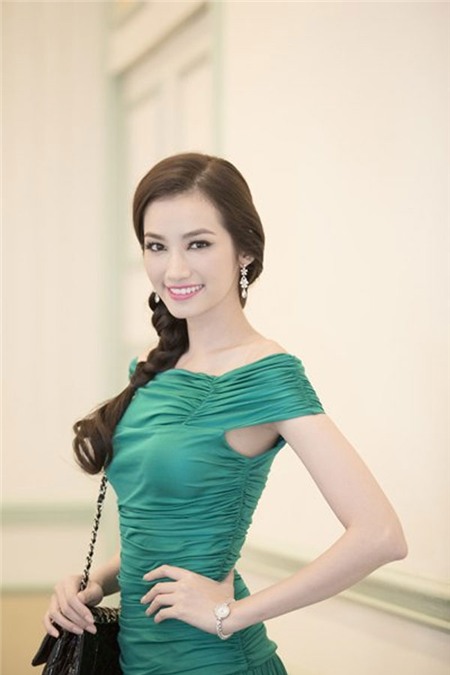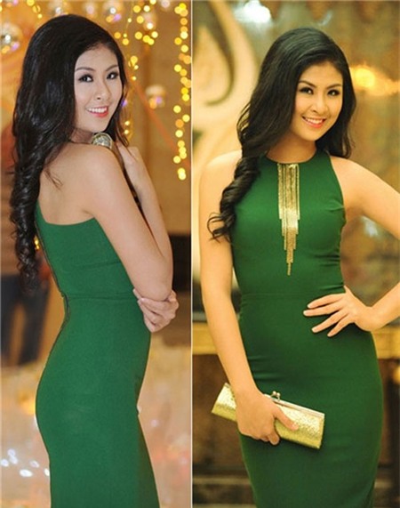 Thông thường với làn da nâu như Hoa hậu Ngọc Hân rất khó mà diện màu xanh ngọc lục bảobởi nó sẽ dễ làm cho làn da của cô càng trở nên tối màu hơn. Tuy nhiên Ngọc Hân đã tinh ý trang điểm gương mặt tươi sáng, cùng với đó cô chọn phụ kiện ví cầm tay màu vàng sáng để khiến mình rạng rỡ hơn.