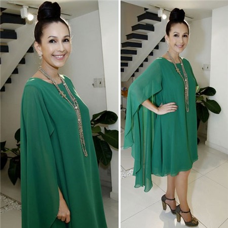"Nữ hoàng ảnh lịch" Diễm My rất sang trọng và trẻ trung với váy xanh ngọc lục bảothiết kế dáng suông.