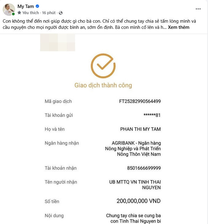 Kèm theo đó, nữ ca sĩ đăng hình ảnh chuyển khoản nóng 200 triệu đồng đến tài khoản UB MTTQ VN Tinh Thai Nguyen.