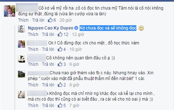 Sau phản ứng của thần tượng, nhiều người hâm mộ bình luận bênh vực Mỹ Tâm trên trang cá nhân của Nguyễn Cao Kỳ Duyên. Nhiều người cho rằng Mỹ Tâm là ca sĩ có tài và tư cách tốt. Trước bình luận của một cư dân mạng trên Facebook MC, Kỳ Duyên thẳng thắn trả lời ngắn gọn cô “chưa đọc và sẽ không đọc”. Theo đó, MC tỏ ra không quan tâm phát ngôn của Mỹ Tâm trước báo giới.