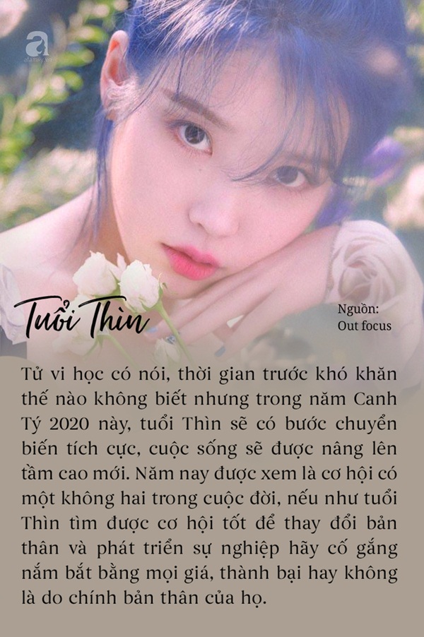 Tử vi học có nói, thời gian trước khó khăn thế nào không biết nhưng trong năm Canh Tý 2020 này, tuổi Thìn sẽ có bước chuyển biến tích cực, cuộc sống sẽ được nâng lên tầm cao mới. Năm nay được xem là cơ hội có một không hai trong cuộc đời, nếu như tuổi Thìn tìm được cơ hội tốt để thay đổi bản thân và phát triển sự nghiệp hãy cố gắng nắm bắt bằng mọi giá, thành bại hay không là do chính bản thân của họ. Nếu mọi thứ suôn sẻ, vào cuối năm nay, tuổi Thìn sẽ thăng hoa viên mãn cả tình lẫn tiền.