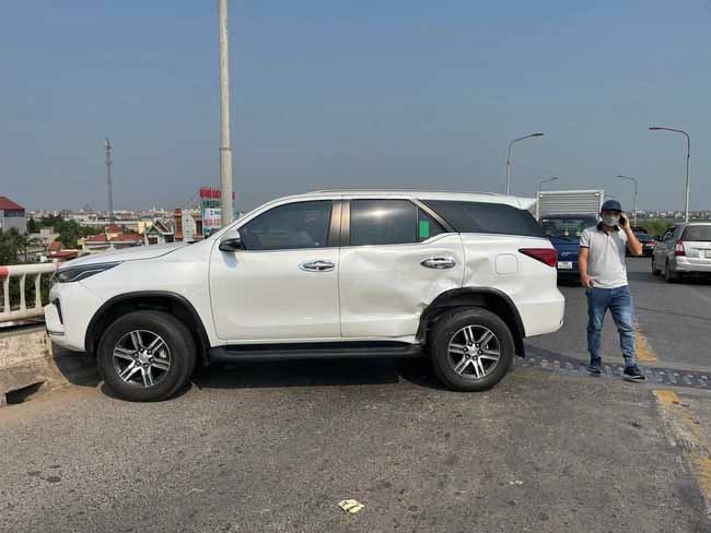Cùng thời điểm này, một xe Fortuner màu trắng khác đi phía sau do tránh vụ tai nạn đã quay ngang, húc vào thành cầu, hư hỏng nhẹ.