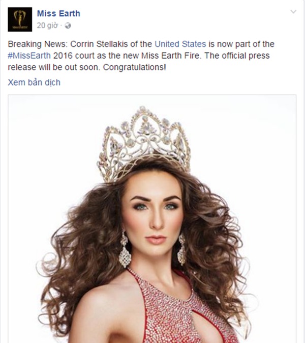 Mới đây, tổ chức Miss Earth chính thức đưa ra thông báo phế ngôi Hoa hậu Lửa - Á hậu 3 của người đẹp Brazil - Bruna Zanardo tại cuộc thi Hoa hậu Trái đất 2016. Người được bổ nhiệm cho ngôi vị này là mỹ nhân đến từ Mỹ - Corrin Stellakis.