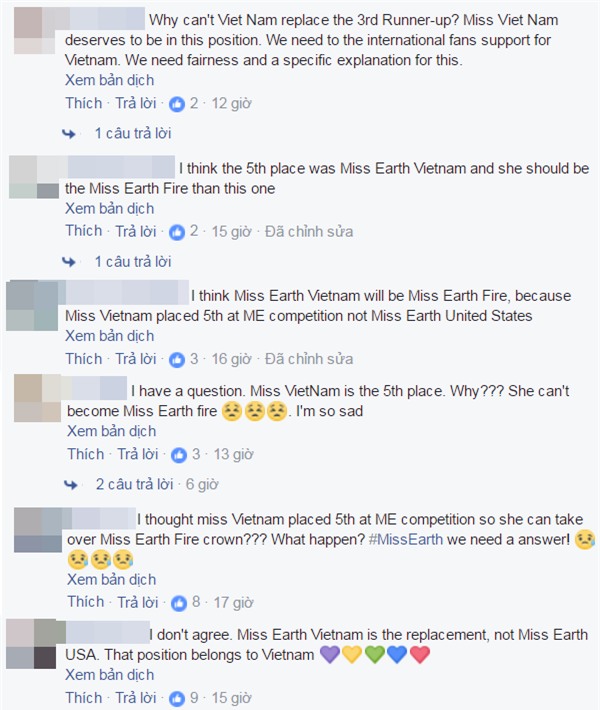 Khi Nam Em không được lựa chọn thay thế cho ngôi vị Hoa hậu Lửa, một bộ phận khán giả Việt Nam cũng như quốc tế cho rằng người đẹp Việt bị "xử ép", đồng loạt lên tiếng đòi lại công bằng cho cô ngay trên trang chủ của cuộc thi Hoa hậu Trái đất.