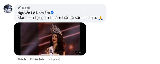 Giữa những tranh cãi của dư luận về động thái của Nam Em, một người có tiếng trong giới sắc đẹp Việt là ông bầu Kiệt hay còn gọi là "má Kiệt" (người từng đứng sau thành công của các Hoa hậu: Phạm Hương, H'Hen Niê, Kim Duyên, Phương Khánh, Diễm Hương, Bùi Quỳnh Hoa...) đã có bài đăng "dằn mặt".