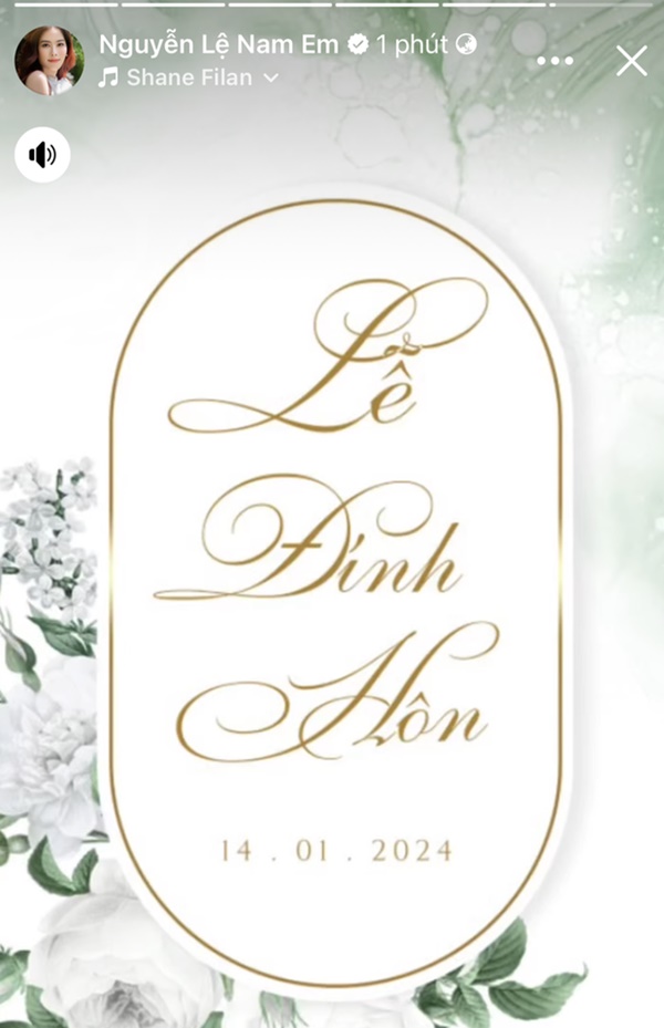 Tối 18/11, trên story cá nhân, Nam Em gây chú ý khi đăng một chiếc thiệp lễ đính hôn với ngày tháng được công bố rõ ràng: 14/1/2024.