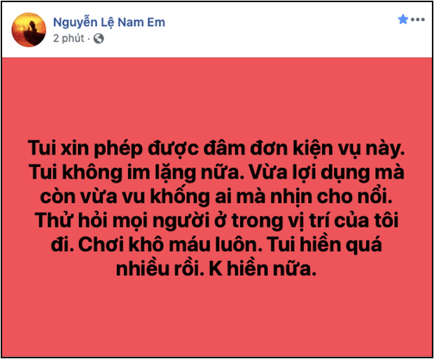 Trước đó, Nam Em từng tuyên bố đâm đơn kiện vì bị vu khống trong ồn ào bị nữ ca sĩ Bảo Trân tố giật chồng.