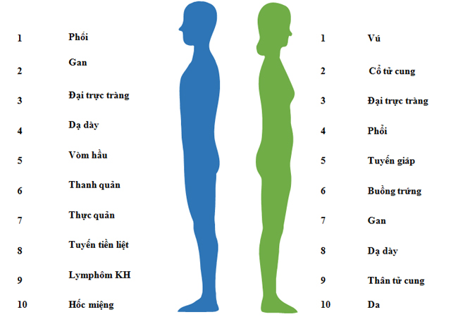 10 bệnh ung thư thường gặp nhất ở nam và nữ.