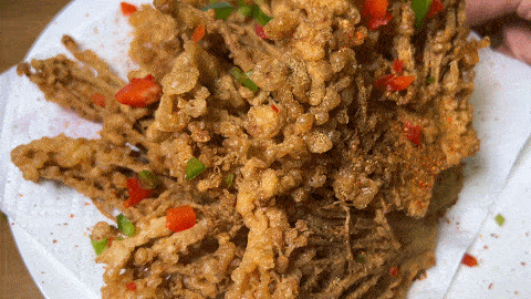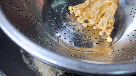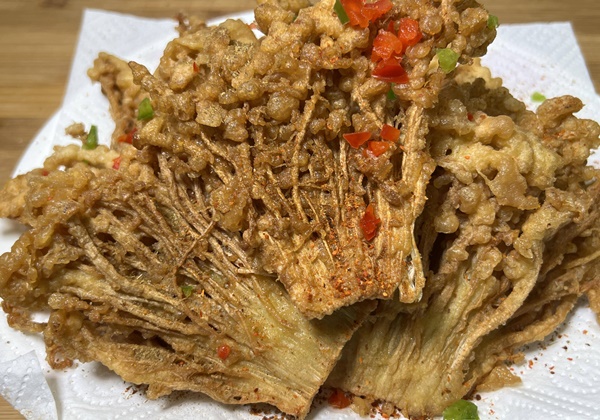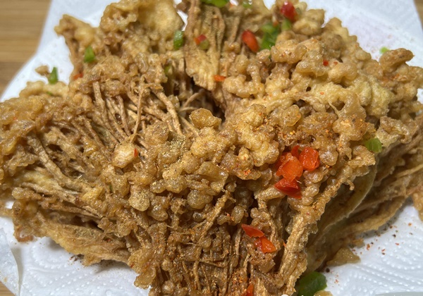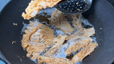 9. Cho dầu vào chảo đến khi sôi, rồi lần lượt gắp nấm vào chiên cho đến khi giòn thì lấy ra thường thức.