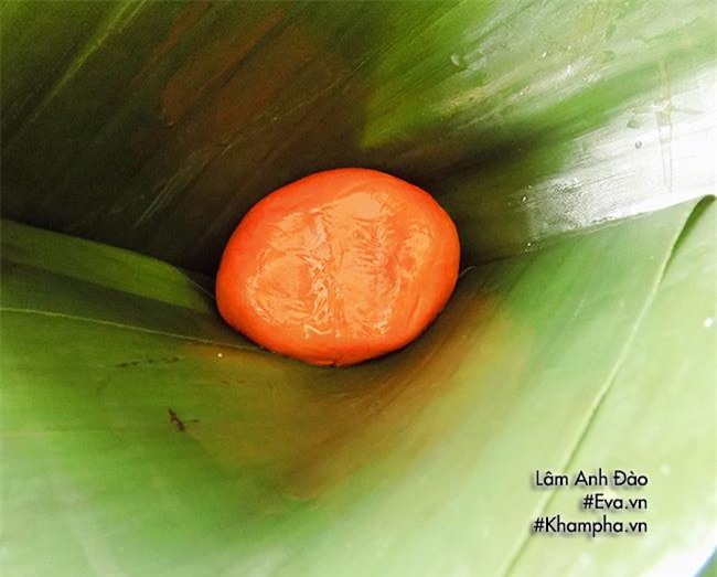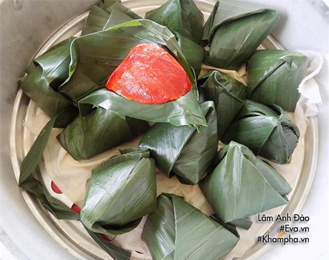 Bước 7: Cho viên bột thoa dầu vào lá chuối đã xếp hình tam giác, gấp hai bên trước và hai đầu sau. Xếp bánh lên xửng.