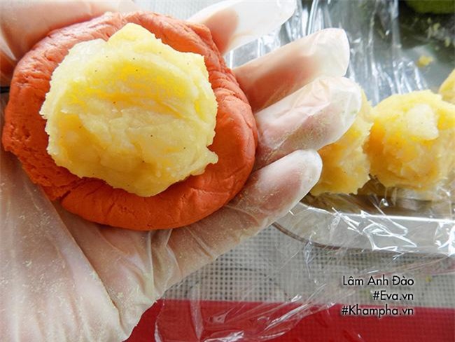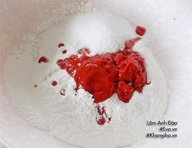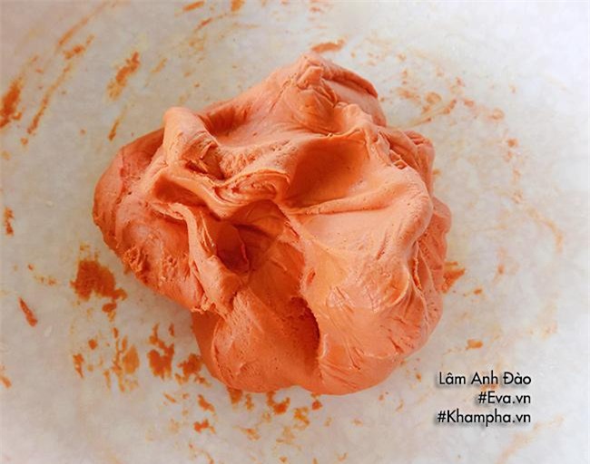 Bước 5: Bột + đường + vani cho vào âu, sau đó cho phần gấc mịn vào mang bao tay trộn. (Nếu bột hơi khô thì cho thêm chút nước ấm, hoặc ngược lại).