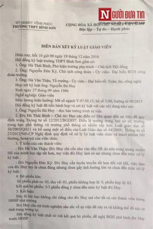 “Ngày 19/12/2016, Hội đồng nhà kỷ luật của nhà trường đã họp cùng với thầy Huy, sau khi nghe thầy Huy đọc tường trình sự việc, chúng tôi đã kết luận: Đây là bài học không chỉ riêng cho thầy Huy mà cho tất cả thành viên trong Hội đồng sư phạm nhà trường. Đồng chí Huy phải nghiêm túc rút kinh nghiệm về sự việc, đồng thời ra quyết định kỷ luật với hình thức phê bình”, thầy Bình cho biết.