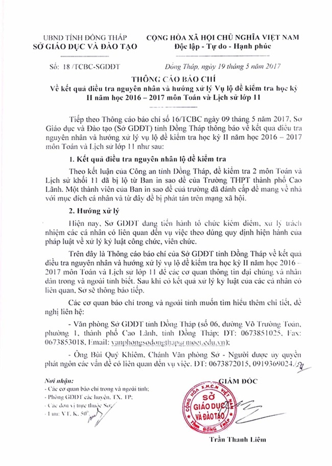 Như đã thông tin, ngày 19/5, sau 10 ngày vào cuộc điều tra, công an tỉnh Đồng Tháp đã có kết luận vụ lộ đề thi lớp 11 làm toàn bộ học sinh khối 10 và 11 của cả tỉnh phải dừng thi.