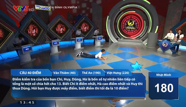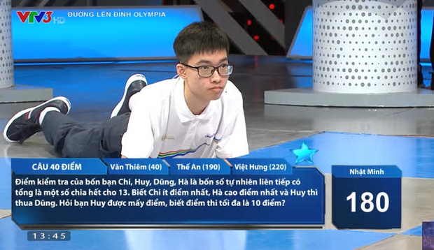 Theo đó, đến câu hỏi 40 điểm trong phần thi Về đích, Nhật Minh đã có hành động khiến MC và khán giả không khỏi ngơ ngác, ngỡ ngàng và bật ngửa. Cậu bạn cho biết mình gặp khó khăn trong việc chuyển tải thông tin từ màn hình máy tính ra giấy nên đã nằm dài để tính toán dễ hơn.
