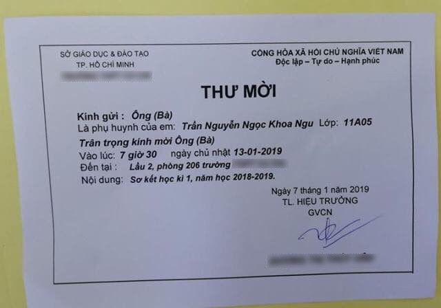 Khoa Nguyên cho biết thêm, đây không phải là lần đầu tiên anh bị đánh sai tên trong thư mời học phụ huynh. Trước đó ở học kỳ 1, anh chàng đã nhận được thư mời bị ghi sai tên của mình. Không ngờ sang học kỳ 2, lỗi đánh máy này vẫn chưa khắc phục.