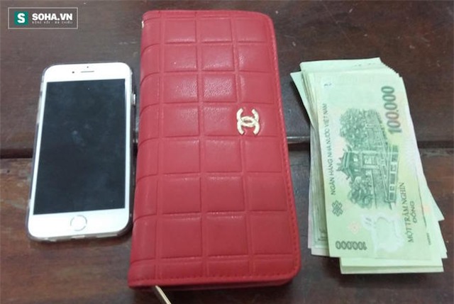 Kiểm tra trong túi, tổ công tác thu giữ chiếc điện thoại iPhone 6 và ví màu đỏ bên trong có 13 triệu đồng.