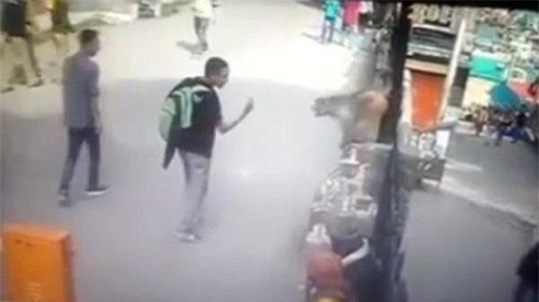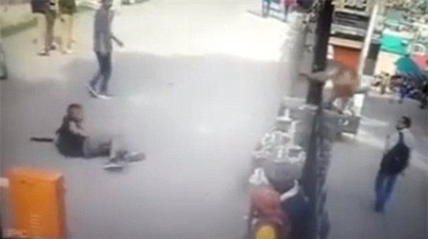 thanh niên. Không chỉ vậy, chú khỉ đã xô ngã cả nam thanh niên nằm bệt