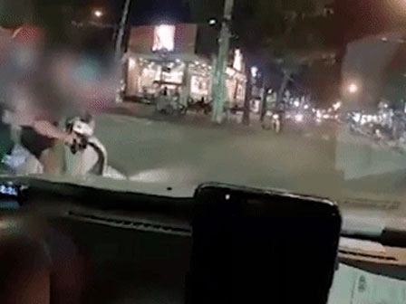 Tuy nhiên, có một thanh niên đi xe máy SH, đèo bạn gái phía sau muốn rẽ phải đã tạt đầu, va vào đầu xe ô tô. Không nhận ra lỗi sai của mình, anh ta còn bực bội chửi bới và đạp liên tiếp mấy cái vào đầu xe khiến đèn xe bị vỡ - theo như người đăng tải clip cho hay.