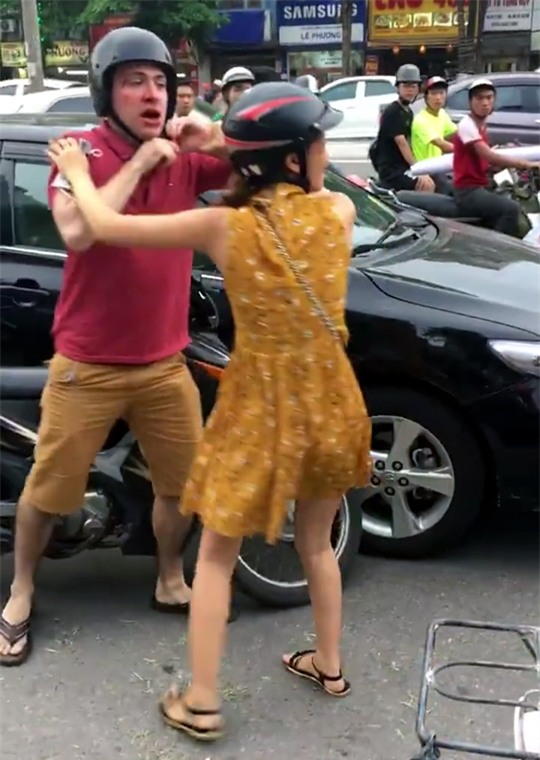 Nhiều người đi đường cố gắng can ngăn hai thanh niên Việt Nam, trong khi một cô gái mặc váy vàng (dường như là bạn gái thanh niên ngoại quốc) cố đẩy “anh Tây” này ra xa.