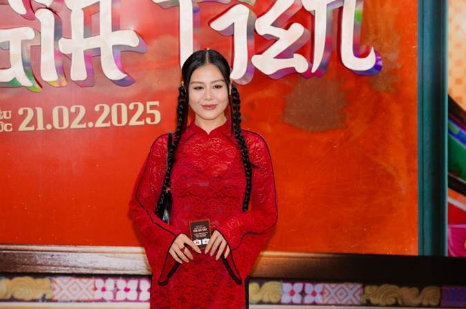Tối 18/2, tại sự kiện chiếu sớm phim của Huỳnh Lập, Nam Thư thu hút sự chú ý khi xuất hiện trên thảm đỏ. Nữ diễn viên lựa chọn bộ áo dài đỏ ren xuyên thấu, kết hợp cùng mái tóc thắt bím.