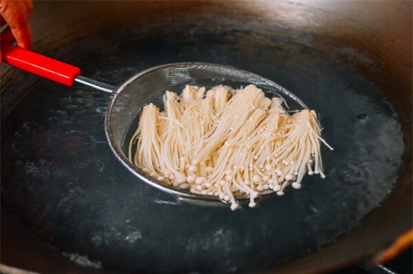 Bắc nồi nước lên bếp. Khi nước sôi thì đặt nấm vào rây rồi đem luộc chín ở lửa vừa. Khi nấm chín thì vớt ra để ráo.