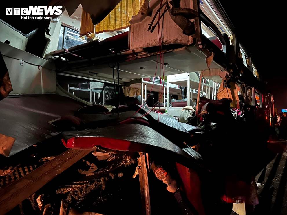 Phần đuôi xe khách phía bên phải biến dạng hoàn toàn sau tai nạn. Những người chết và bị thương đều nằm ở những giường cuối xe. (Ảnh: NV)