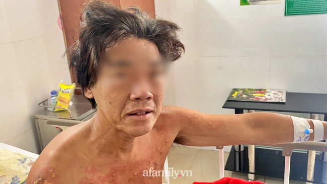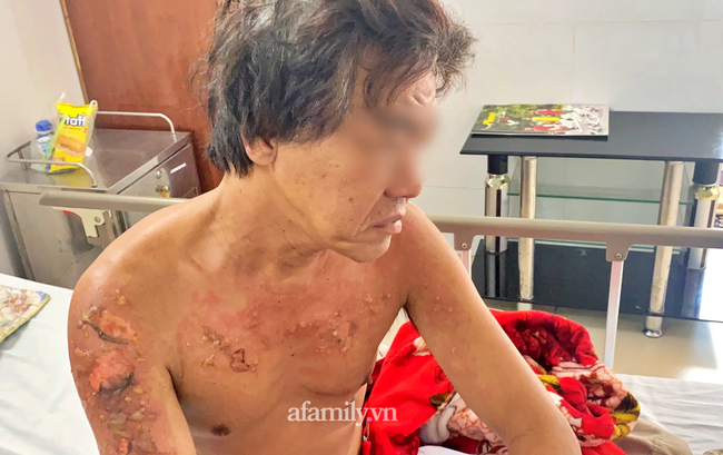 Tại giường bệnh, trên vùng cánh tay và ngực của người đàn ông các vết bọng nước có dấu hiệu vỡ ra.
