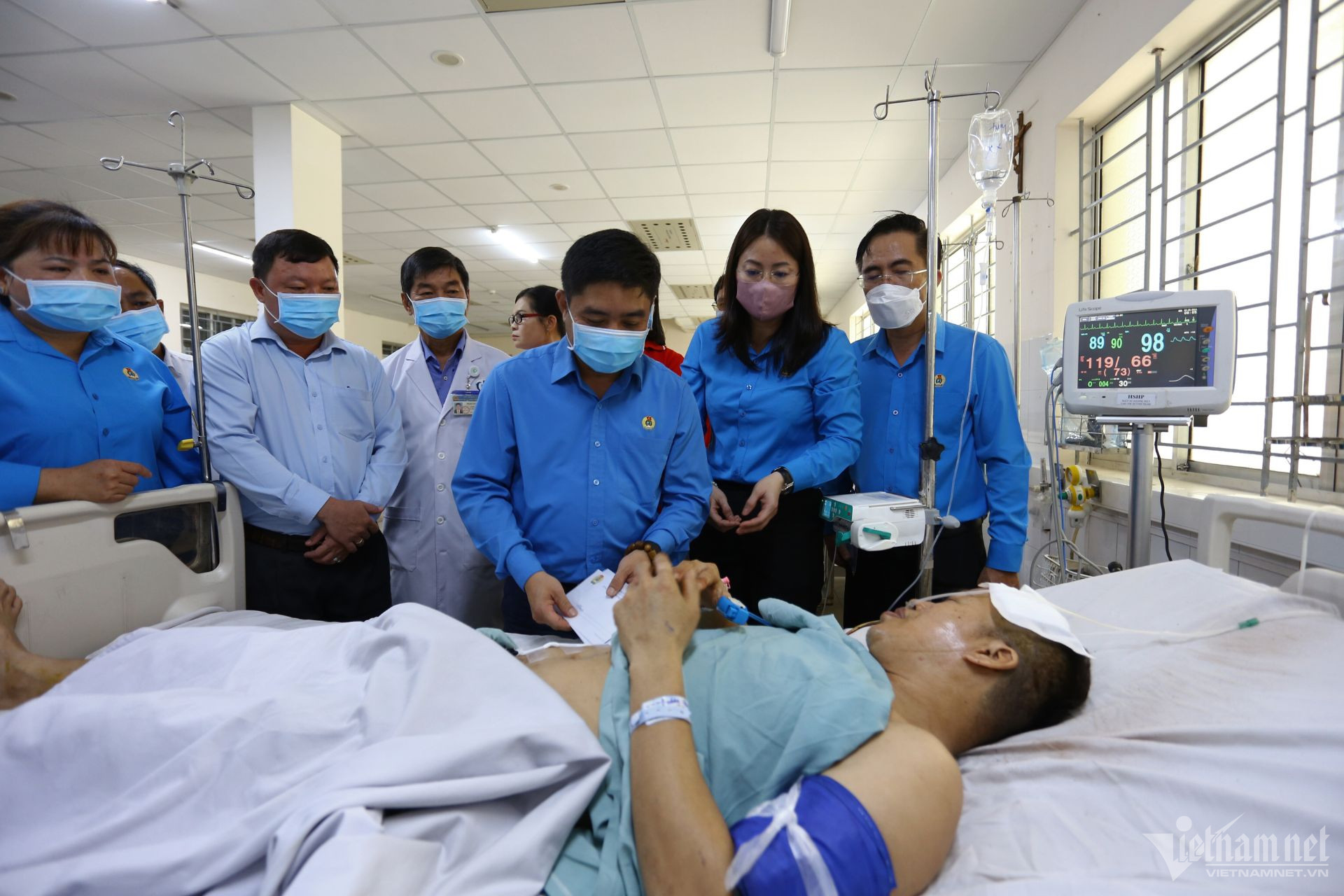 Đại diện Tổng Liên đoàn Lao động Việt Nam thăm hỏi anh Tùng. Ảnh: Hoàng Anh