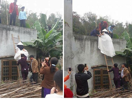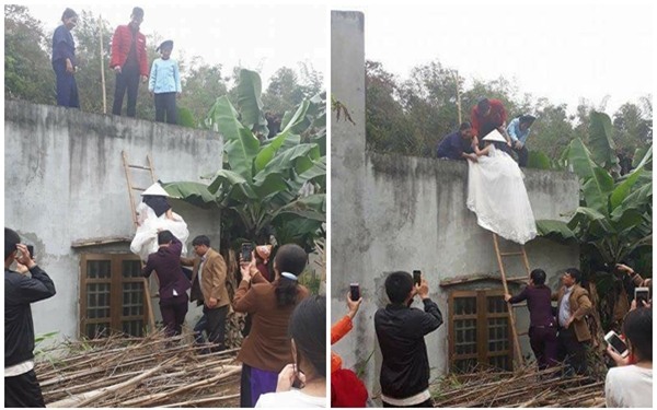 Từ xưa đến nay, các cô gái vẫn thường hình dung ngày mình lên xe hoa lúc nào cũng lộng lẫy xinh đẹp, áo cưới trắng tinh, tươi cười rạng rỡ bên chú rể vu quy nhà chồng. Đó là ngày trọng đại nhất đời chỉ sau ngày cất tiếng khóc lọt lòng mẹ, và ai cũng ước mong cả đời chỉ 1 lần đò thôi, nên cô gái nào cũng cố gắng để rực rỡ nổi bật nhất. Theo như phong tục truyền thống thì dạm ngõ, ăn hỏi xong là nhà trai xin dâu về, nếu ai rước dâu 2 lần thì cô dâu lặng lẽ trốn về nhà đẻ rồi chính thức đón lần 2. Tuy nhiên, vừa mới đây, hàng ngàn người tỏ ra bất ngờ, choáng váng khi chứng kiến cảnh cô dâu đội nón, xách váy leo thang tre để vào nhà chồng, chứ không đàng hoàng đi cửa chính như chúng ta vẫn nghĩ.
