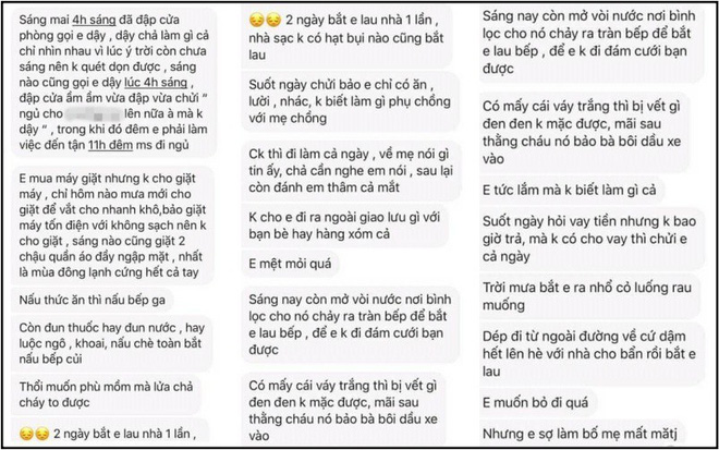 Theo như những gì cô gái chia sẻ, cuộc sống làm dâu của cô là chuỗi ngày vất vả, cực nhọc cùng với sự vô tâm và thói vũ phu của chồng. Chẳng hạn như việc bị gọi dậy bằng được lúc 4 giờ sáng mà chẳng phải làm gì, hay như việc bị vặn vòi nước chảy tràn ra bếp để ở nhà dọn dẹp không được đi ăn cưới… Còn rất nhiều những việc quá đáng hơn nữa khiến cư dân mạng không thể ngừng phẫn nộ.