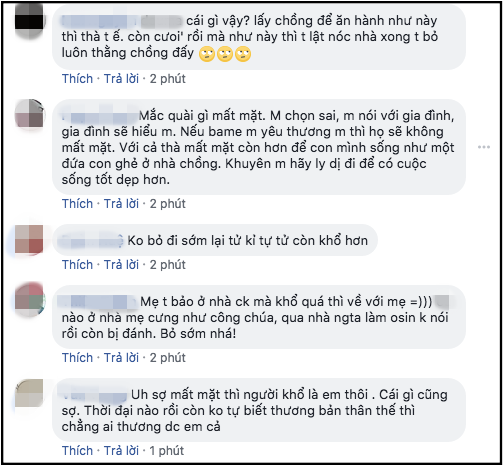 "Thời nào nữa mà sợ mất mặt hả bạn? Hôn nhân tự nguyện mà, không sống được với nhau nữa thì bỏ thôi chứ sao phải giữ cho mình khổ vậy."