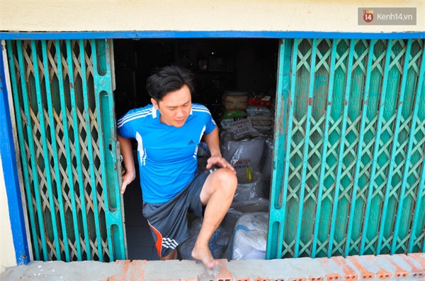 Người phụ nữ đang chui vào nhà là mẹ của anh Thông. Anh cho biết, mẹ bị đau lưng mà cứ phải chui suốt như vậy để ra vào nhà.