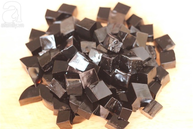 Khi thạch đông lại, bạn cắt thạch sương sáo thành từng miếng vuông mỏng vừa ăn.