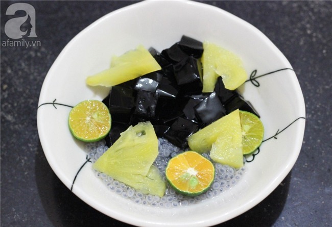 Cắt đôi vài quả quất cho vào bát, thêm sương sáo, hạt é vào rồi chan nước dứa đường phèn vào và thưởng thức thôi!