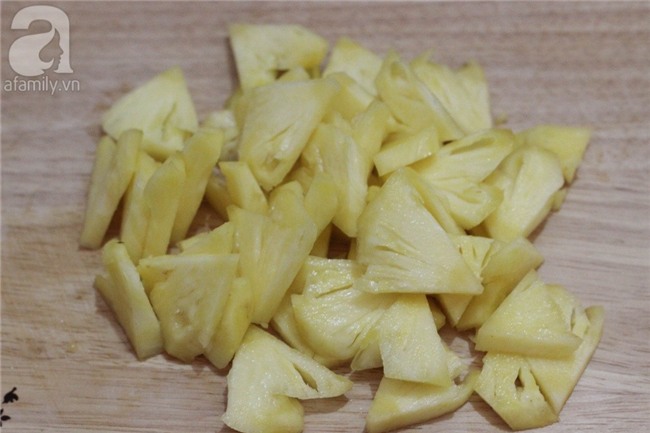 Dứa gọt vỏ, bỏ mắt, cắt miếng nhỏ vừa ăn.