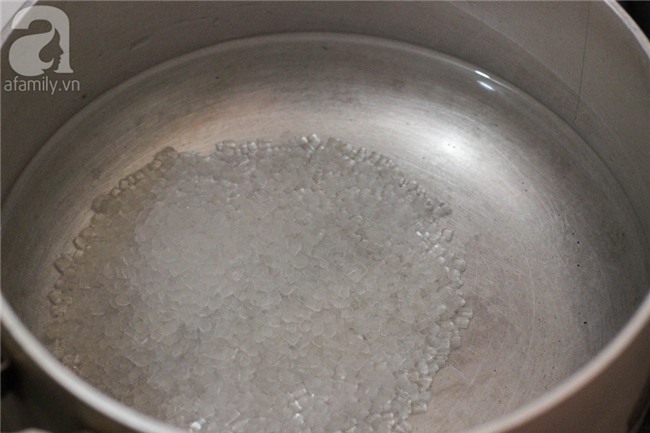 Đổ nước và đường phèn vào nồi, đun sôi. Lượng đường tuỳ thuộc vào khẩu vị của bạn.