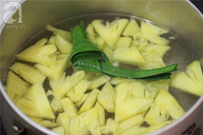 Khi nước sôi và đường tan hết, bạn cho dứa và lá dứa vào nồi đun chừng 3 – 5 phút thì tắt bếp.