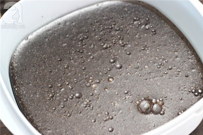 Khi nồi thạch sương sáo sôi thì bạn tắt bếp, đổ thạch ra hộp đựng, đợi cho thạch nguội sẽ đông lại.