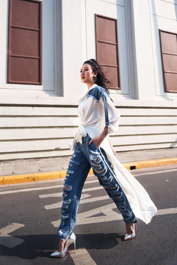 Trút bỏ những bộ cánh bánh bèo, Hà Thu bất ngờ "đổi gió" với phong cách nổi loạn cùng quần jeans rách te tua mix áo dáng dài bụi bặm.