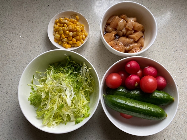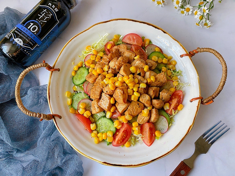 Đổ thịt gà, ngô ngọt vào đĩa rau quả sau đó thêm gia vị trộn salad vào trộn đều là xong.