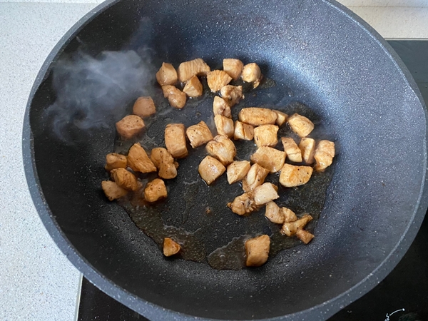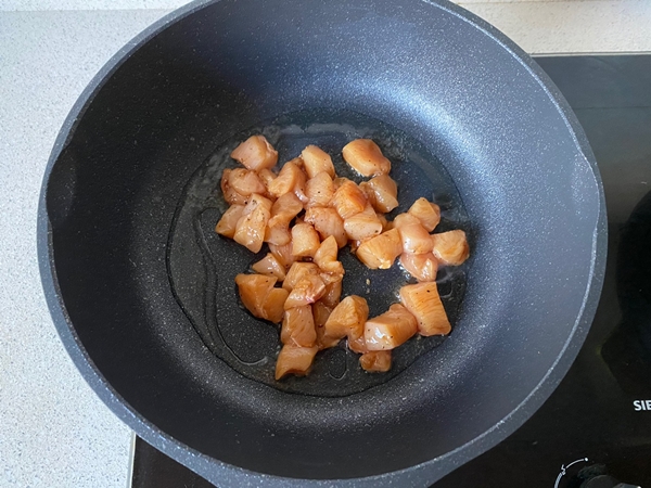 Đun nóng một ít dầu ăn trong chảo, đổ thịt gà vào đảo đều.