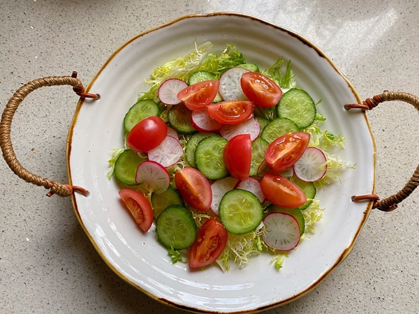 Cho rau diếp xoăn vào đĩa, thêm dưa chuột và củ cải thái lát. Tiếp đó thêm cà chua bi đã cắt miếng vừa ăn vào.