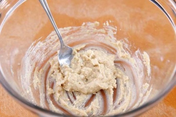 Cho chao vào bát rồi dùng thìa nghiền nát, thêm rượu nấu ăn, đường, tinh bột ngô, dầu mè và hạt tiêu vào trộn đều.