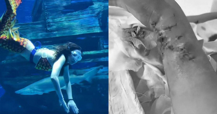 "Nàng tiên cá" bị cá mập cắn khi đang luyện tập ở thủy cung. (Ảnh: Sohu)